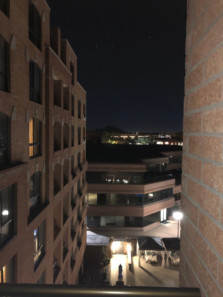 April 16, 2024, Tuesday night, 8:44pm, pacific standard time, hotel room in Scottsdale, Arizona,USA. Turns out I didn’t need to change hotels. When they announced the meeting last month it sounded like we would be staying close to the office. Instead, the meeting and dinner were in Gilbert and the hotel is 25 minutes away in Scottsdale. It would have been easier to stay another night in Chandler. But I am kind of glad it worked out this way. The hotel is a nice one in old town Scottsdale and staying in a different city gives me a new perspective on Arizona. I was overdoing it on nostalgia the last couple days in Chandler and needed a different experience.