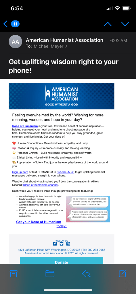 July 21,2025, Monday evening, 6:48pm,pacific standard time, apartment in Dana Point, California, USA. This morning I got an email from the American Humanist Association. “Get uplifting wisdom right to your phone!” Said the subject line. When I opened the message I was offered what they call a “dose of humanism.” Three texts a week “…helping you reset your heart and your mind one direct message at a time.” This made me happy. I have been looking for a way to access the AHA. I am also excited by the concept of the email. I have been looking for a way to share my thoughts through direct messaging. It gives me an idea of how I can connect with people.