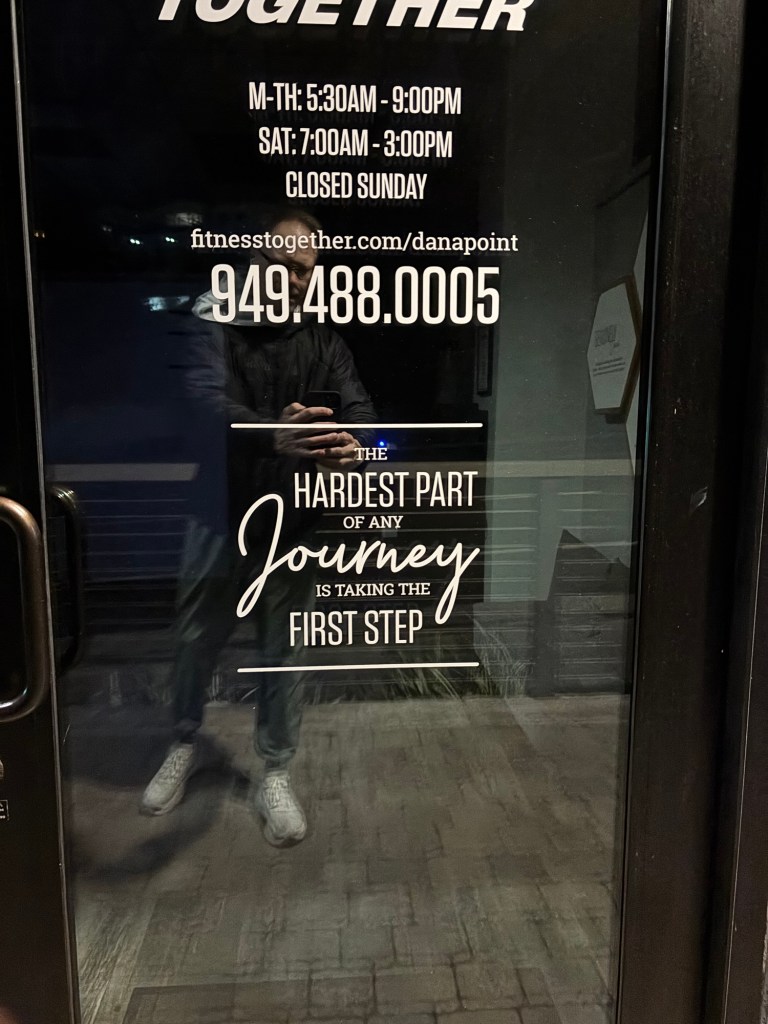 April 17,2026, Friday morning, 5:21am, pacific standard time, apartment in Dana point, California,USA. Yesterday after work I took the dog for a walk before driving around with my daughter. I got to bed late so didn’t get up until 4am. Yet I was still able to complete the OC/santa Clara route. On the way I saw this written on the door of a local gym. I thought it was a good quote and very accurate. My personal quote, especially when it comes to early morning walking is, “the hardest part about getting up is getting up.”