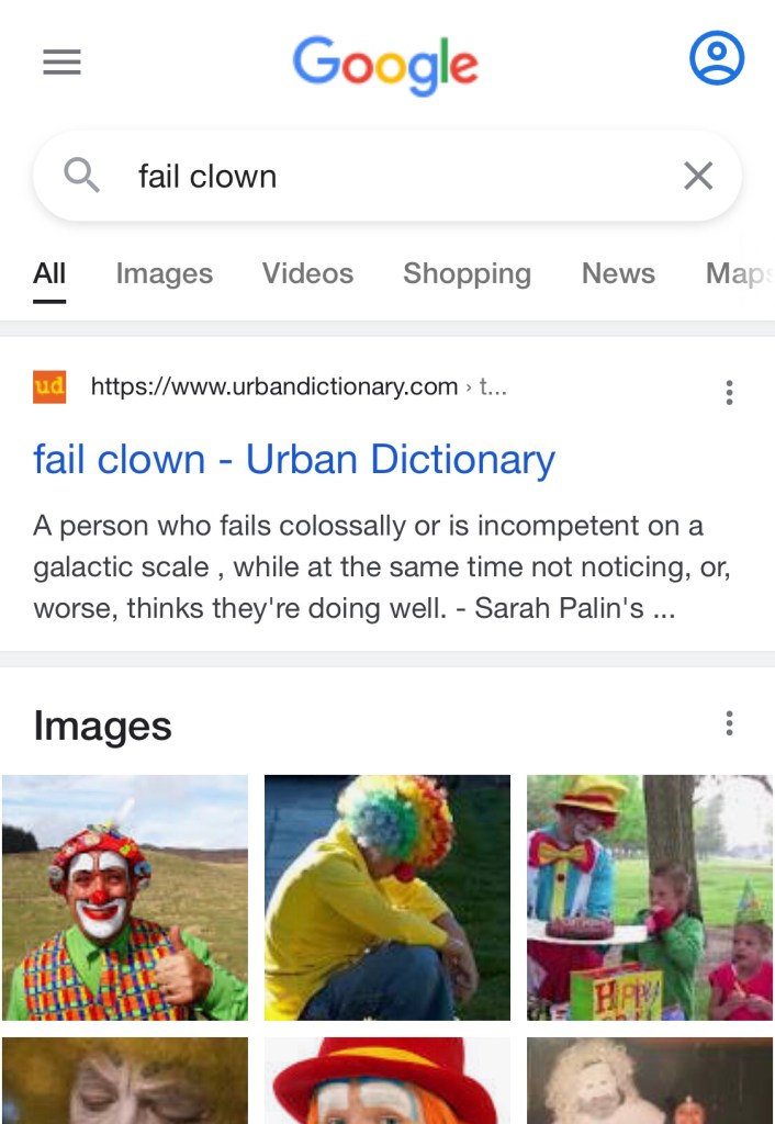 4:45pm I am having a a self defeating afternoon…according to urban dictionary: a Fail Clown is, “person who fails colossally or is incompetent on a galactic scale, while at the same time not noticing, or worse, thinks they are doing great”